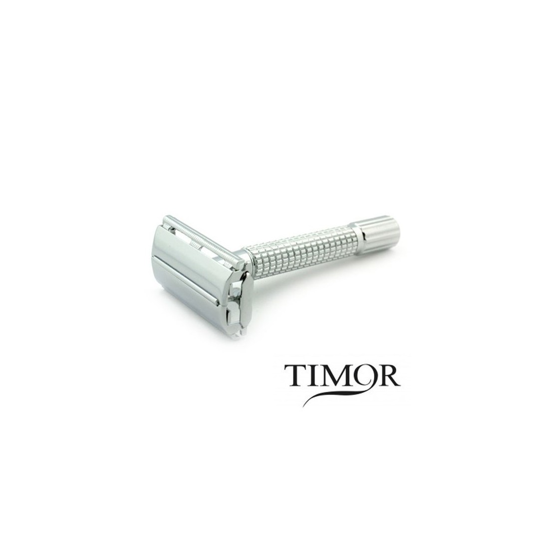 Rasoio di sicurezza con apertura a farfalla. Corpo in metallo cromato opaco.